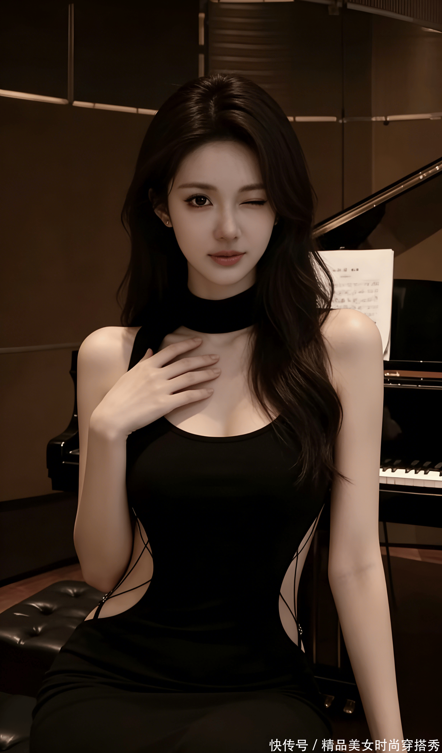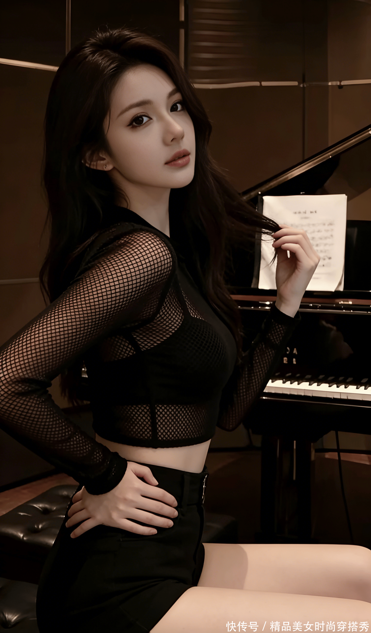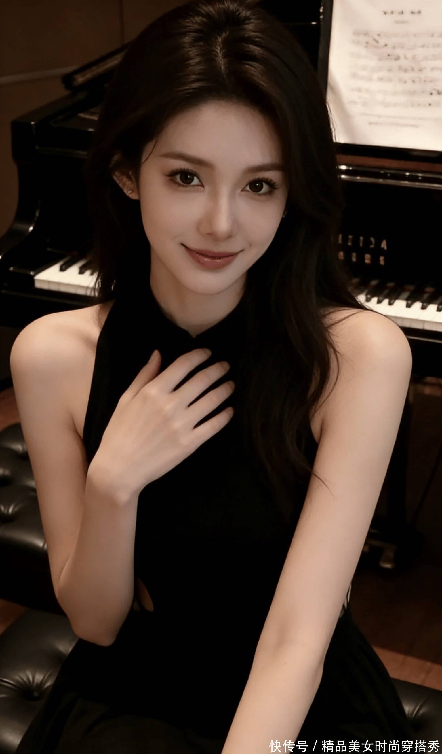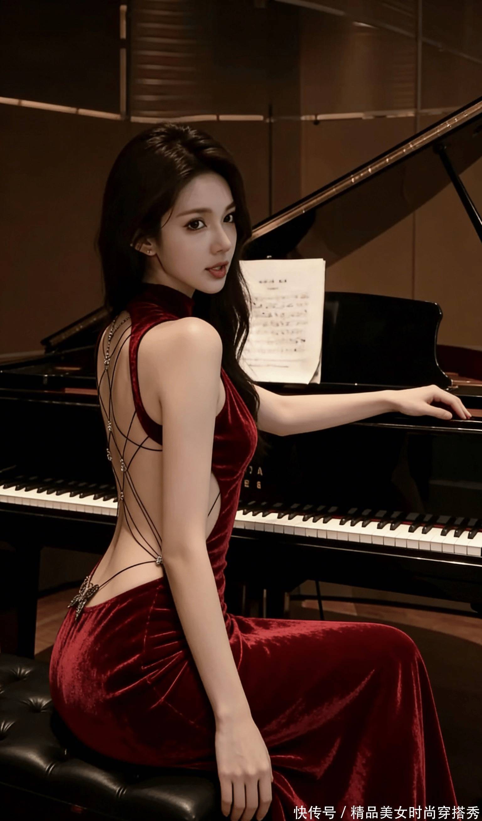 背景的钢琴上放着乐谱,暖黄的灯光将她的身影衬得愈发柔和,丝绒的光泽和钢琴的冷硬形成了温暖的对比,像一杯加了奶的蓝调鸡尾酒,入口是甜的,回味却带着让人上头的烈。她的眼神带着几分疏离,却又在看向镜头时添了几分勾人的笑意,这种矛盾感反而让她更具魅力。