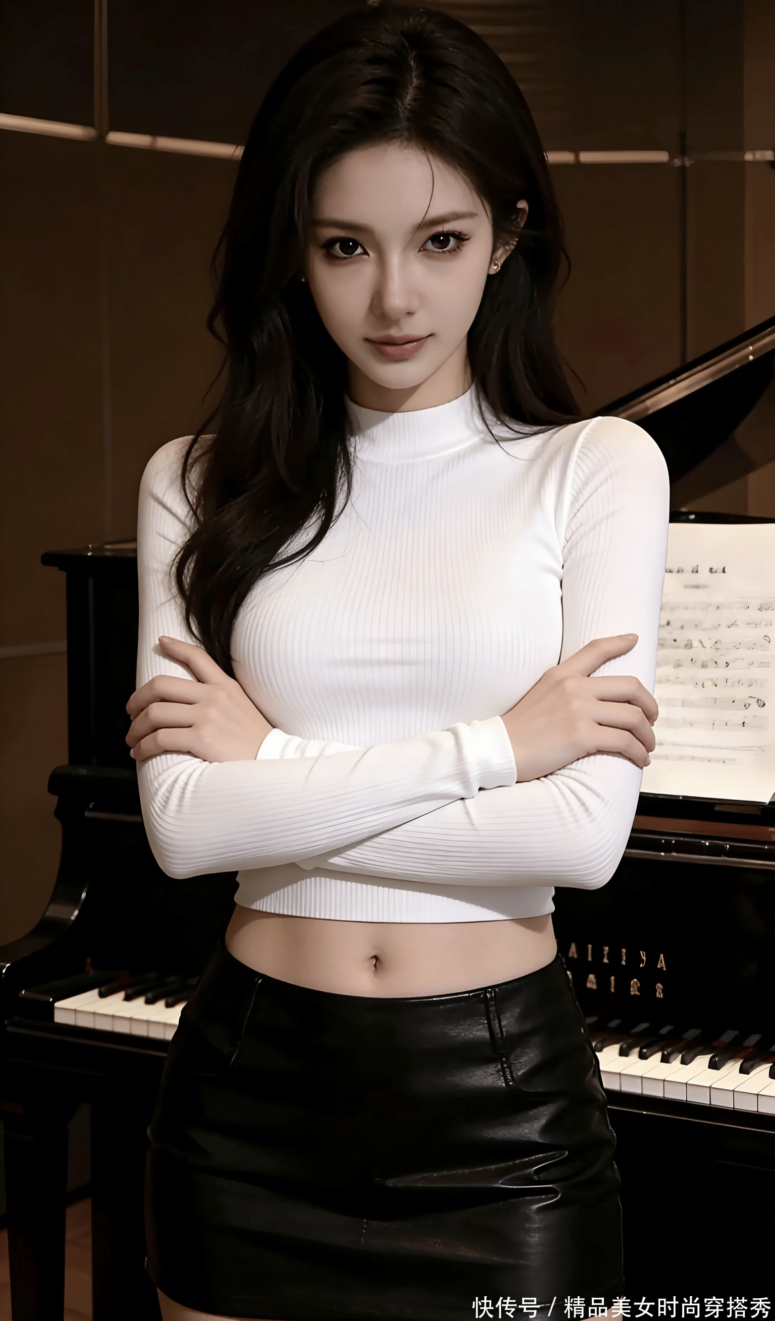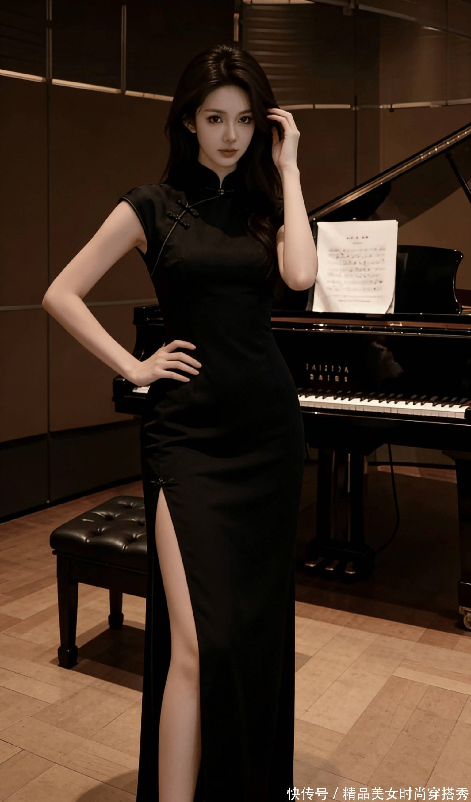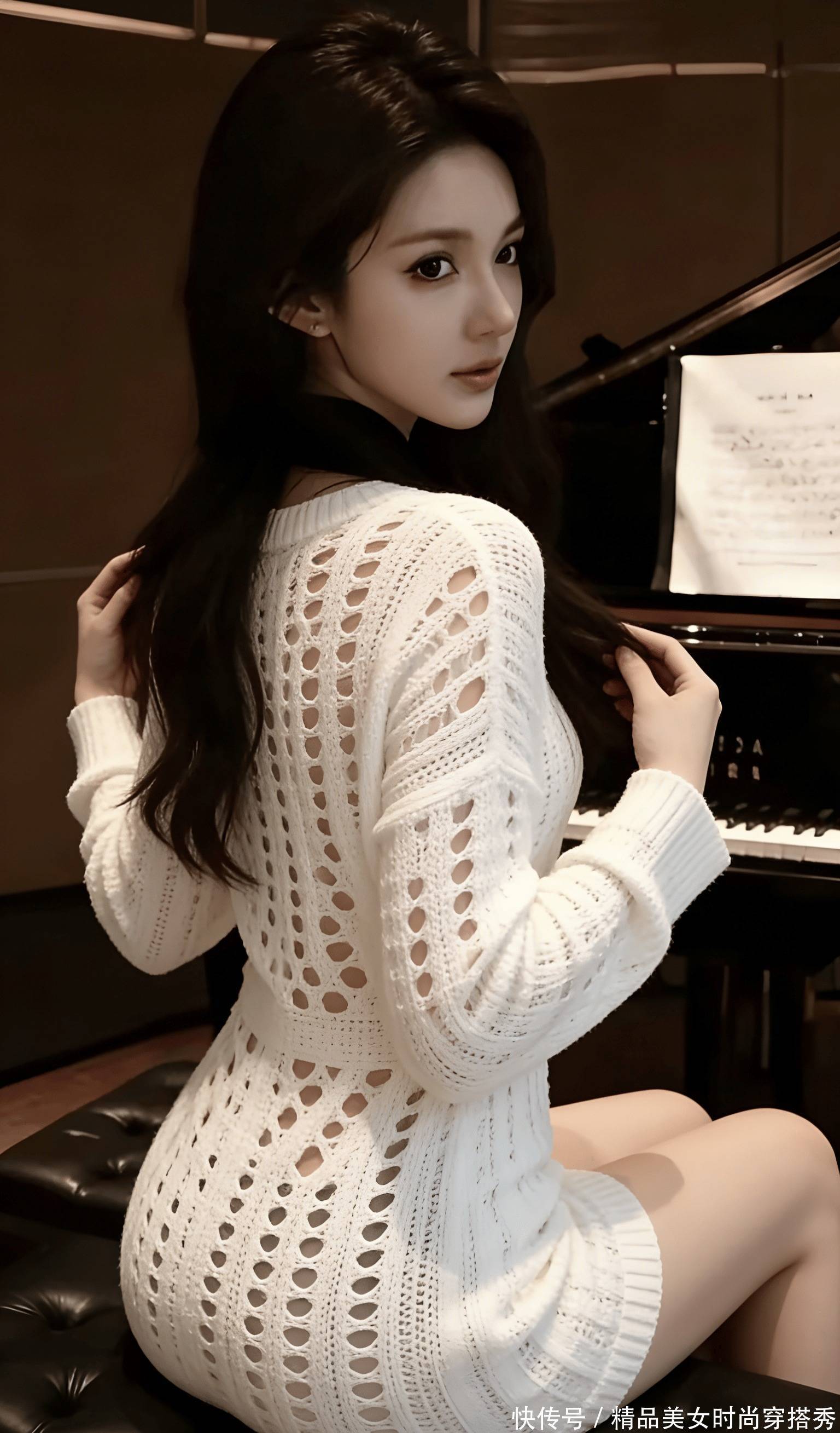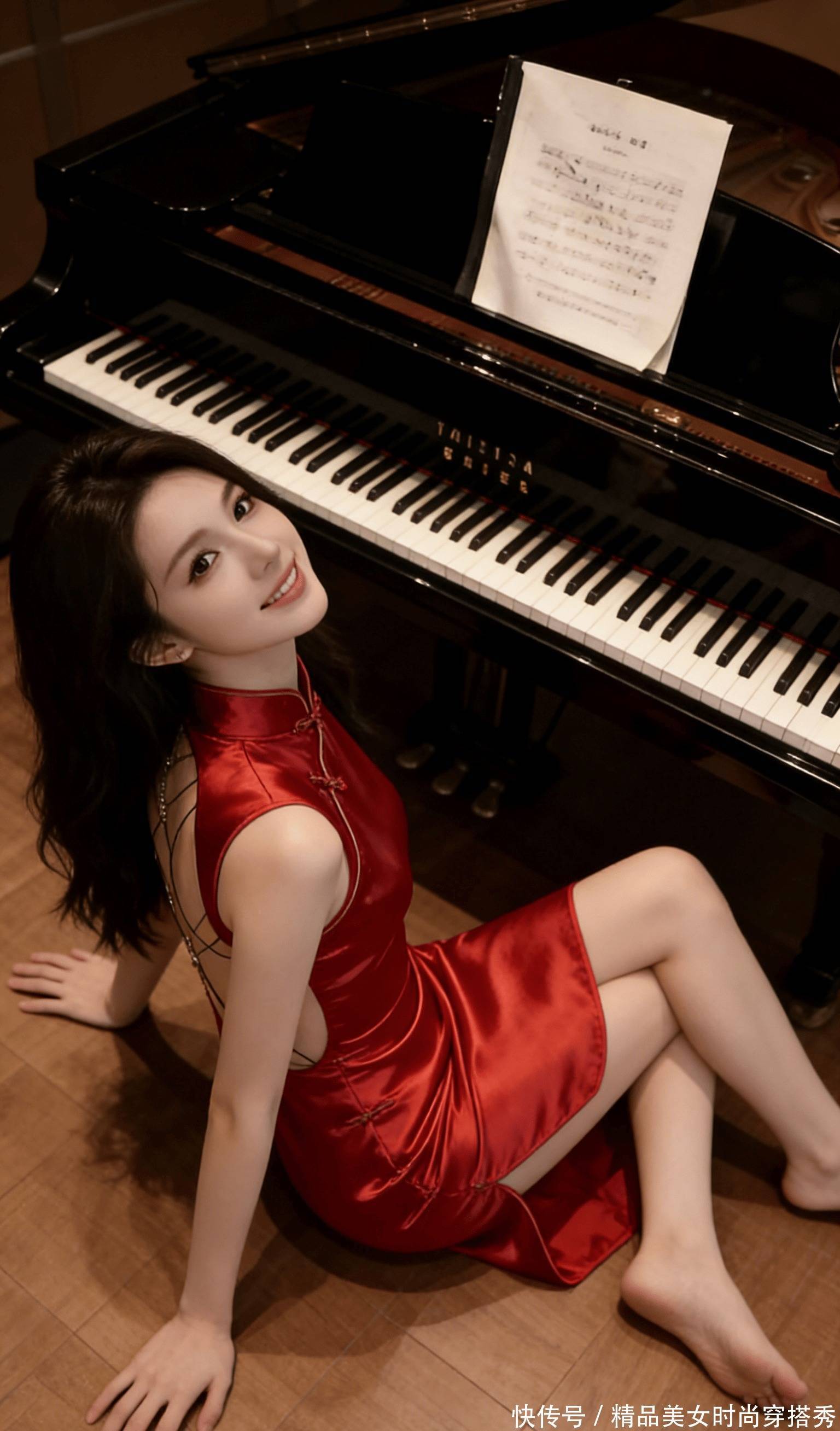 背景的钢琴上放着乐谱,暖黄的灯光将她的身影衬得愈发柔和,丝绒的光泽和钢琴的冷硬形成了温暖的对比,像一杯加了奶的蓝调鸡尾酒,入口是甜的,回味却带着让人上头的烈。她的眼神带着几分疏离,却又在看向镜头时添了几分勾人的笑意,这种矛盾感反而让她更具魅力。